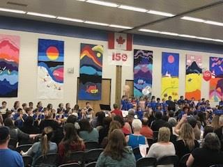The performance celebrated Canada’s geography and development from coast to coast. Some topics included the history of the Acadians, the First Nations People, building the railroad, settlement, and respecting and acknowledging the land. The student learning also included a Ted Harrison inspired mural for each province and area that was created by each class. These large murals also supported the ambiance for the celebration and showcased further student work and evidence of teamwork. A huge thanks to Ms. Lietz for all of her work on this performance.